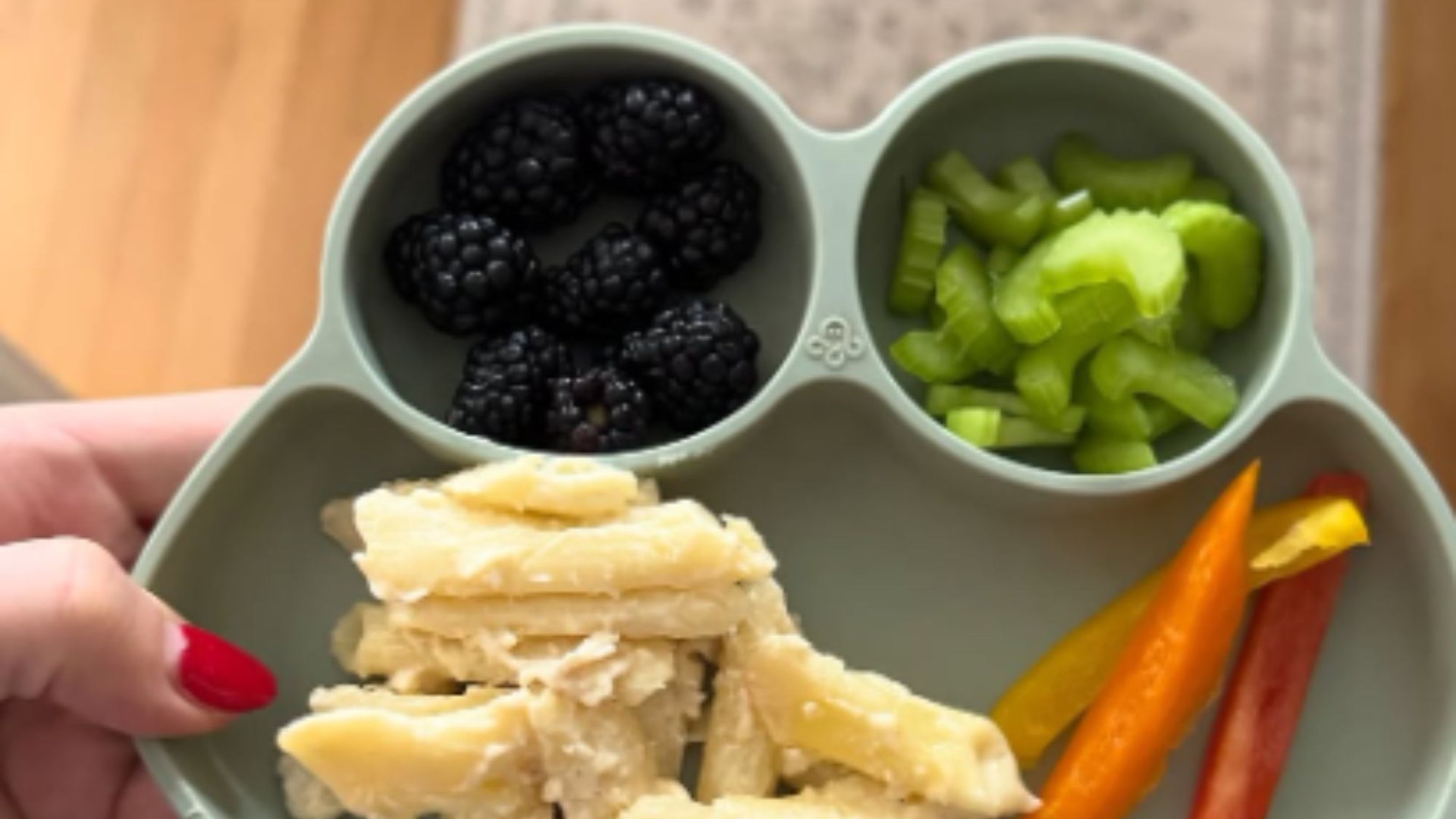 Hannah presented her with a plate of tuna pasta, peppers, blackberries, and celery.