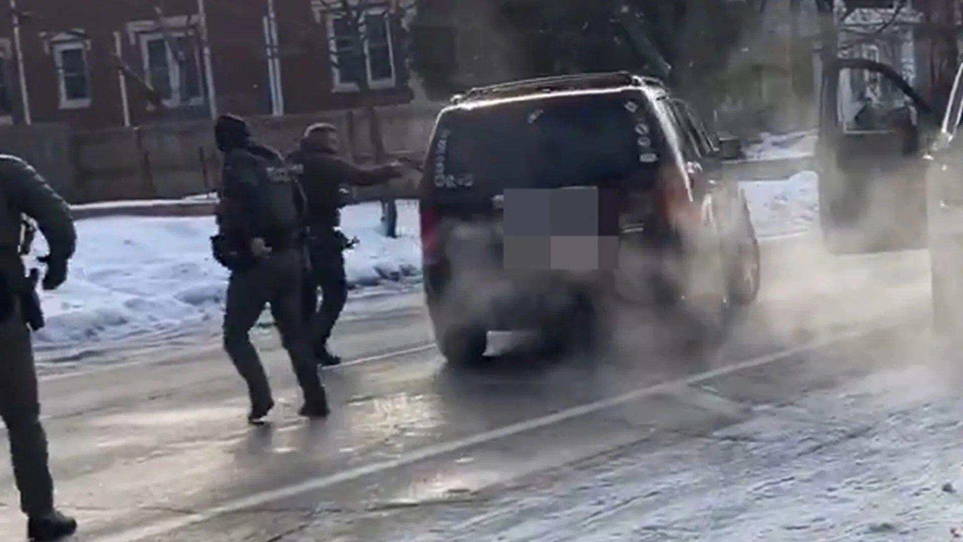 One officer is seen yanking on the driver’s door handle and attempting to open the door through an open window.