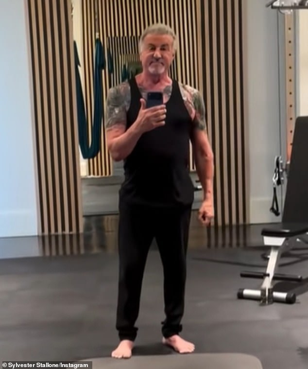 Sylvester Stallone showcased his tattooed biceps in rare footage of himself inside the gym of his $35.3 million Palm Beach, FL mansion on Sunday