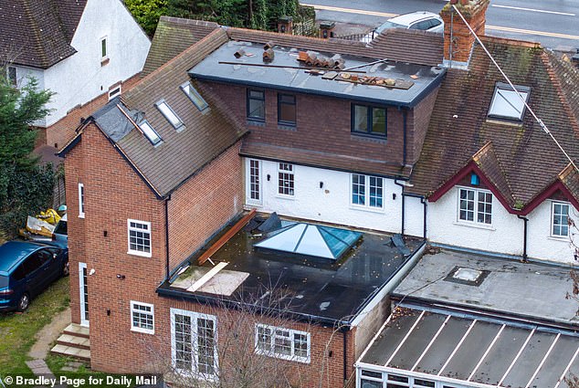 An overhead view of the back of Mr Hussain’s Berkshire home. Works remain unfinished, with patching on part of the roof