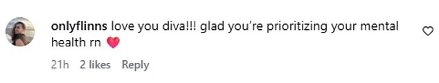 Taking to the comments, fans shared their support for the star as they penned: 'love you diva!!! glad you¿re prioritizing your mental health rn'