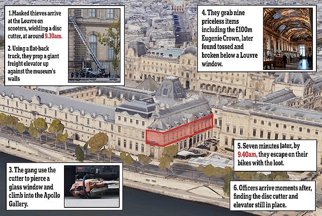 Masked and wielding angle grinders, the group parked up their scooters outside the gallery, home to jewels belonging to Napoleon Bonaparte, his wife Josephine and a string of subsequent Emperors and Empresses.