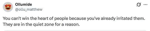One wrote dryly: ‘You can’t win the heart of people because you’ve already irritated them. They are in the quiet zone for a reason.’