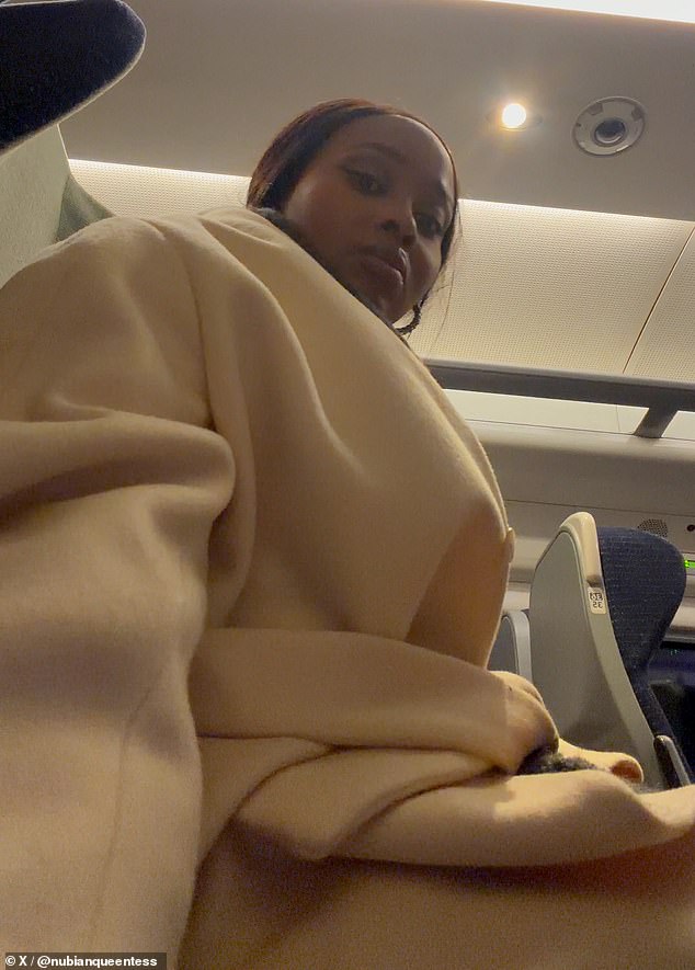 She can be heard saying: ‘Hello everyone, I know this is a quiet zone so I’m just going to take two minutes.