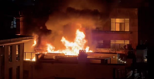 Crowds of shocked festive revellers could be seen looking on, while plumes of smoke from the blaze could be seen from further away.