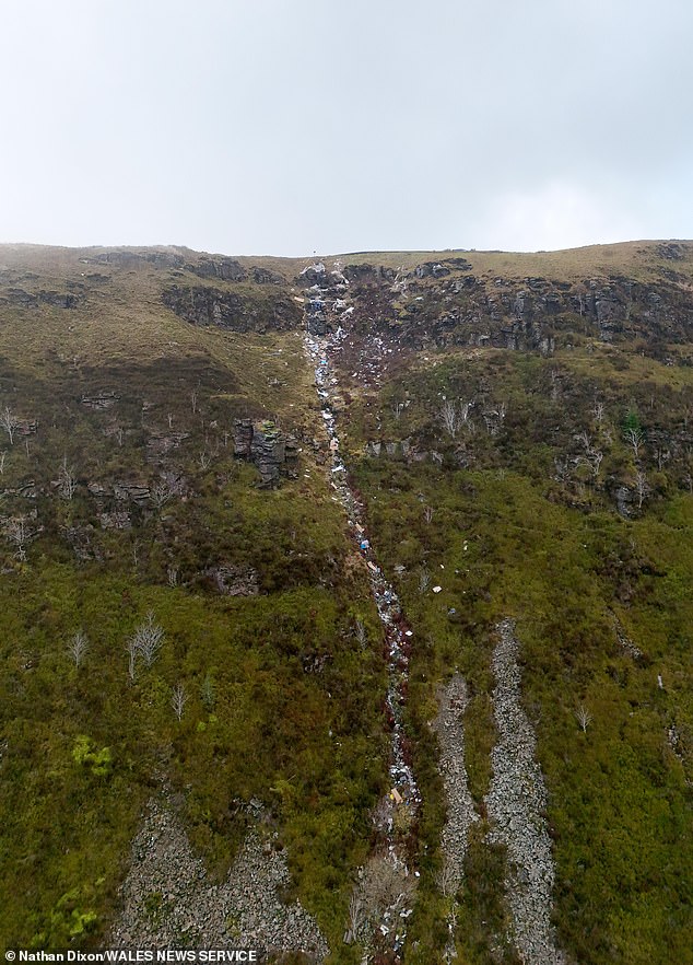 Drone videos show the garbage strewn across the beautiful South Wales countryside on Bwlch Mountain in Treorchy.