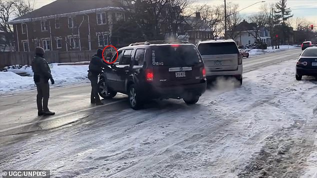 Amateur video of the Minneapolis incident shows the uniformed ICE officer, who fired the fatal shots, may have stepped directly in front of the vehicle driven by Ms Good (pictured)