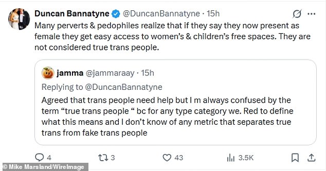 He added: ‘Many perverts & pedophiles realize that if they say they now present as female they get easy access to women’s & children’s free spaces. They are not considered true trans people.’