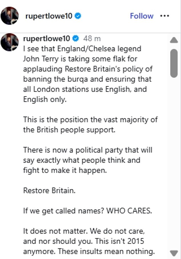 Terry’s apparent views were displayed on an Instagram post by Rupert Lowe, the former Reform UK MP who recently launched another political party called Restore Britain.