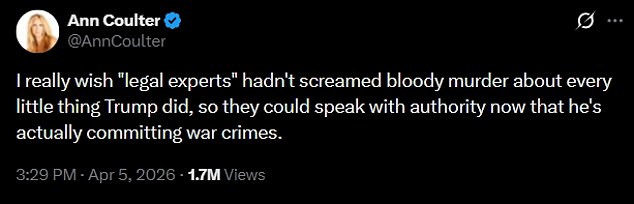 Ann Coulter, 64, accused Donald Trump of overseeing in ‘war crimes’ in Iran on social media Sunday Sunday