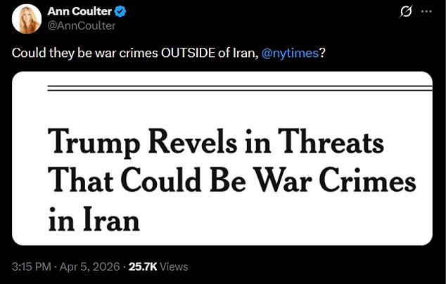 Coulter wrote: ‘Could they be war crimes OUTSIDE of Iran, @nytimes?’