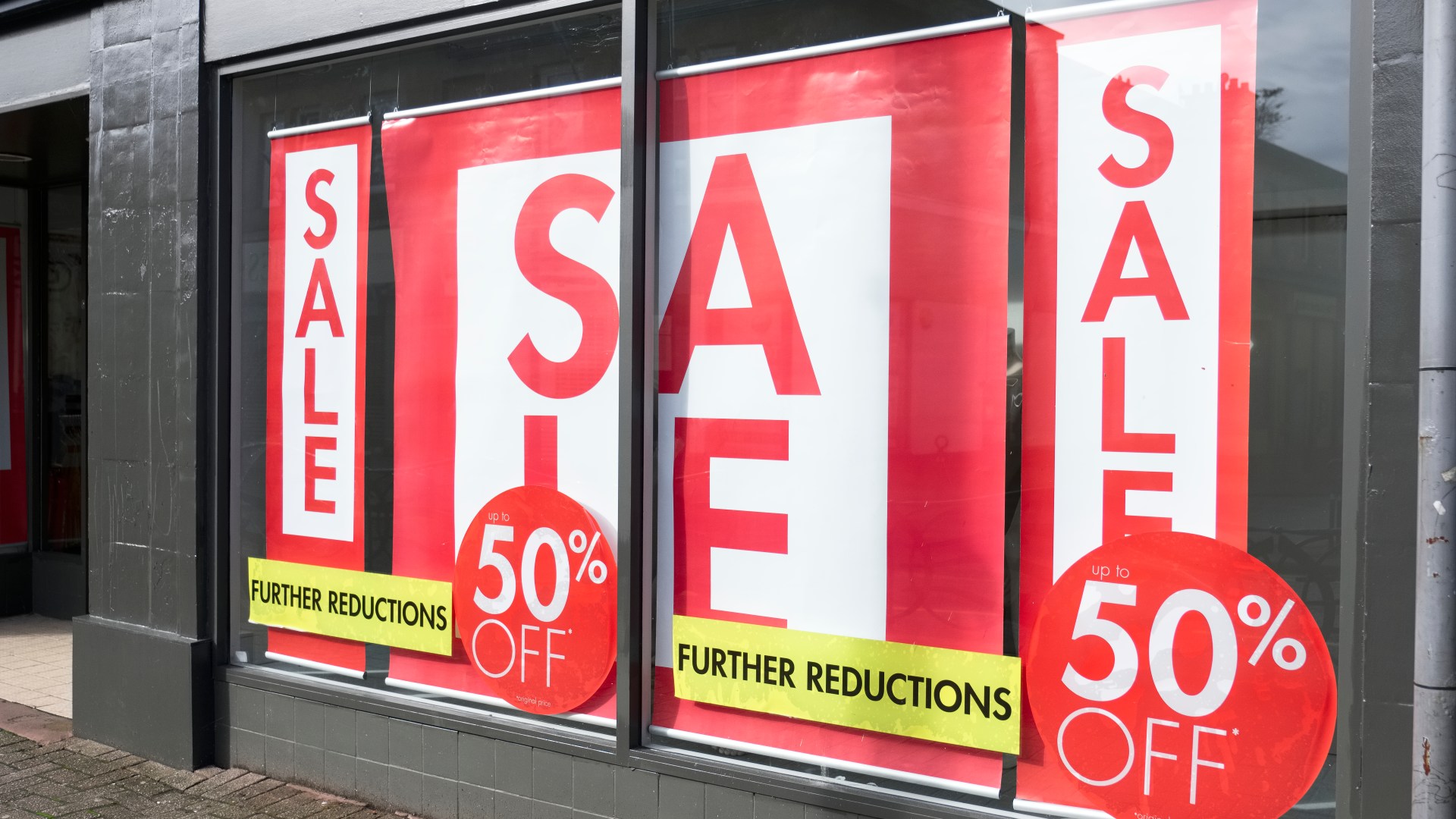 Shop window with red and white "SALE" signs, with "up to 50% OFF" and "FURTHER REDUCTIONS" banners.