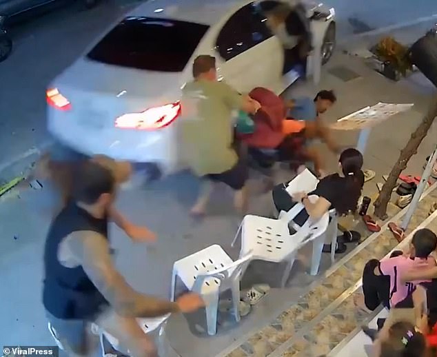 Disturbing footage showed the driver was only half inside the vehicle when it took off, crashing into staff of the massage shop and passers-by, including an Australian dad pushing his son in a stroller.