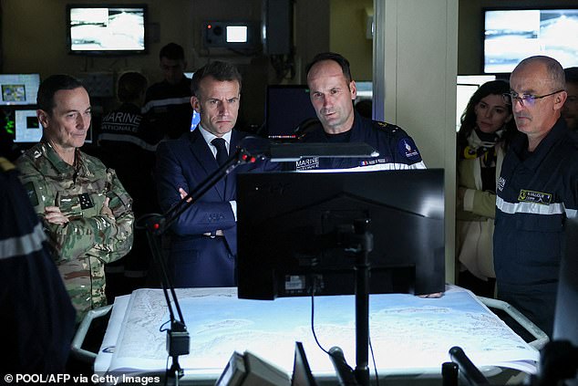 Emmanuel Macron has ordered French Navy ships to the Strait of Hormuz in an ‘unprecedented’ bid to combat skyrocketing oil prices (The French President, middle left, is pictured at the bridge of a warship on Monday)