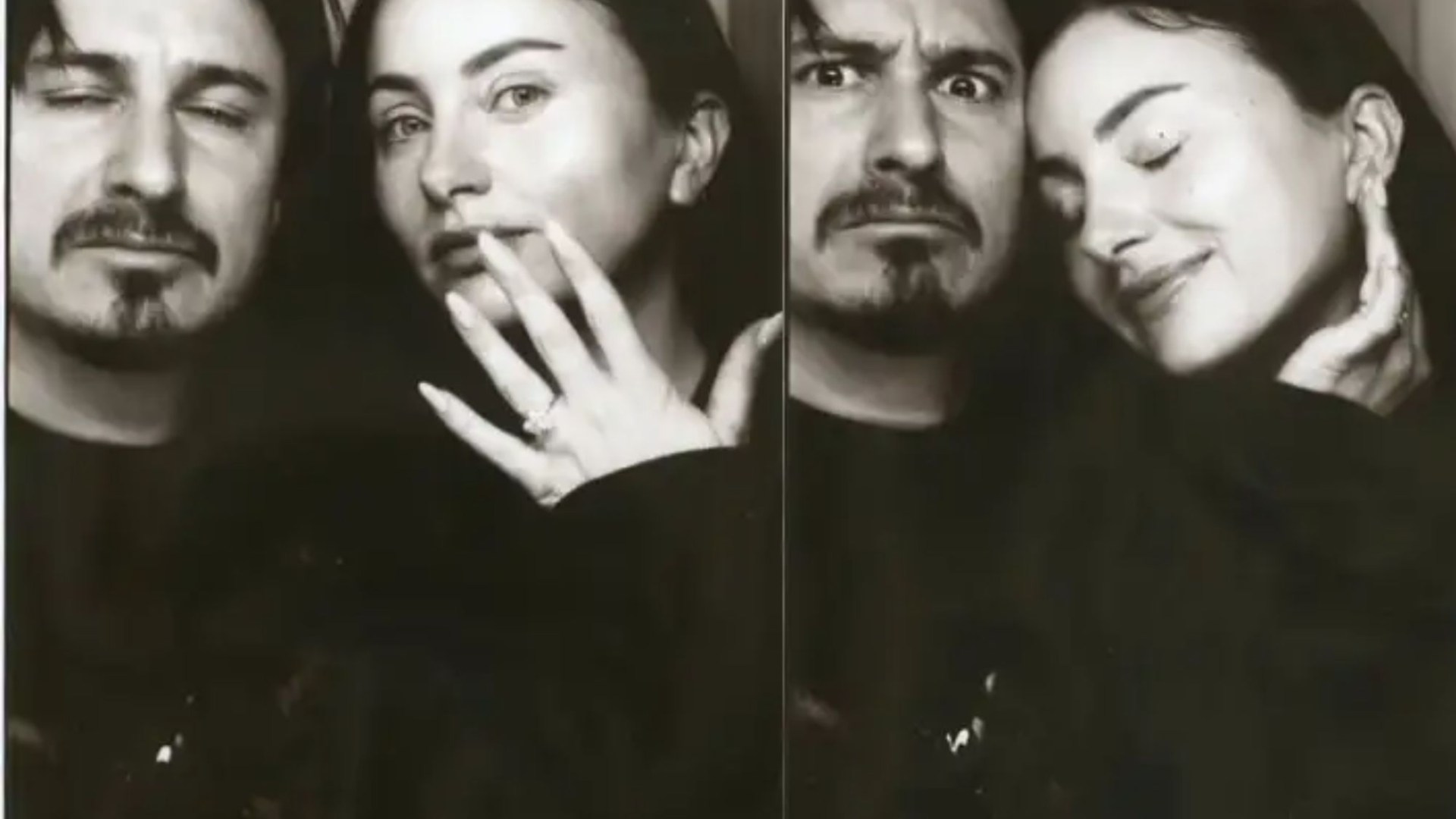 Plebs star Tom posed a black and white photo of Sky showing off her huge diamond engagement ring.
