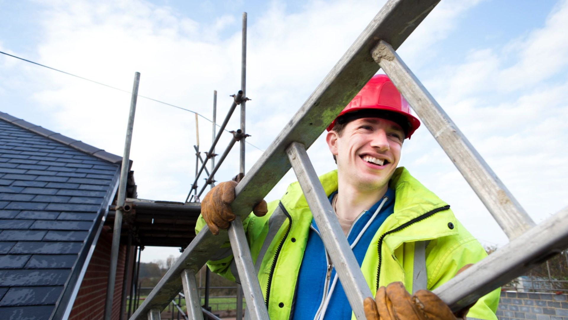 An image collage containing 1 images, Image 1 shows Happy young builder carrying a ladder on the roof