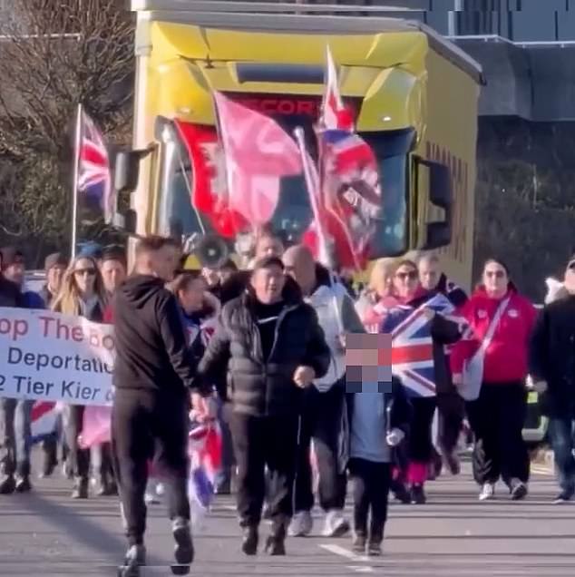 A convoy of agitators had earlier made a slow march from The Golden Lion pub to the port, forcing traffic on the A20 to slow to a crawl as they chanted ‘Enough is enough, send them back,’ and ‘Keir Starmer is a w***er.’