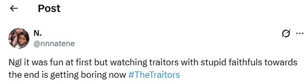 One wrote: ‘Ngl it was fun at first but watching traitors with stupid faithfuls towards the end is getting boring now.’