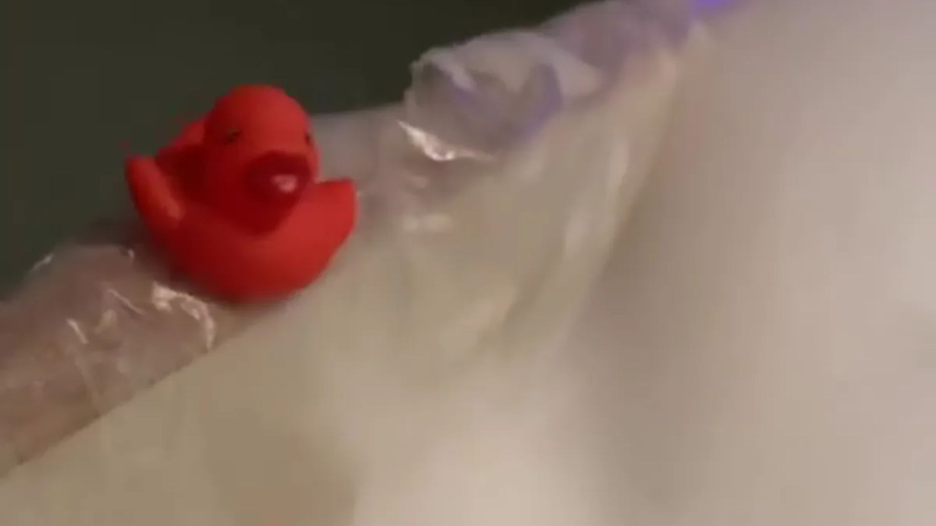 The clip shows him pouring bubble bath into water in the tub made from wooden boards and plastic bags.
