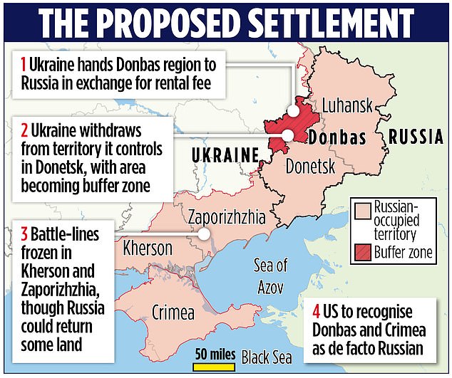 Under the White House-Kremlin plan, Ukraine would cede territory its troops have defended since February 2022, including the Donbas region in the east, and slash the size of its military. Sanctions against Russia would be lifted and, crucially for Vladimir Putin, the country would be ‘reintegrated into the global economy’.