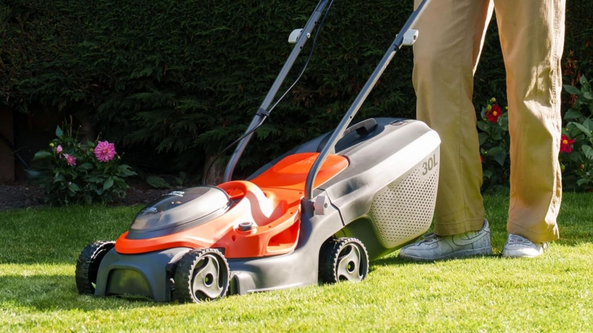 The Flymo 18V SimpliMow 320 Cordless Lawnmower avoids the need for a strimmer, as it has built-in grass combs to mow right up to the edges of the lawn.