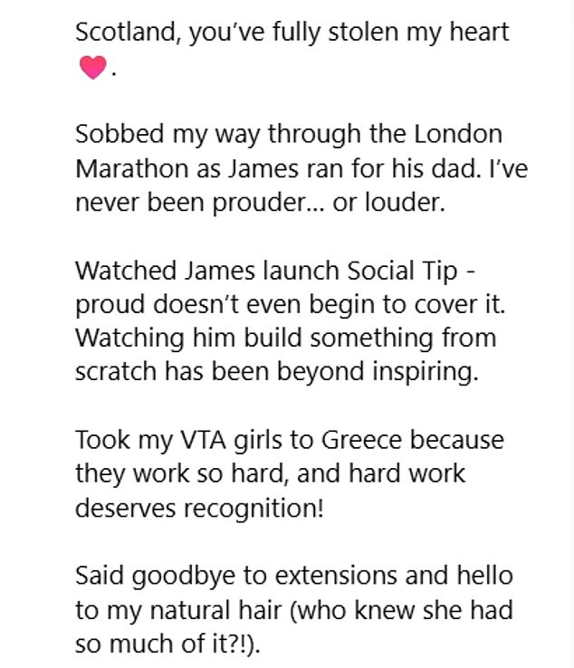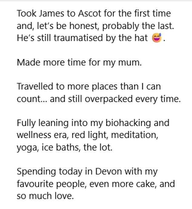 She also shared her gratitude for becoming a stepmum to James’s children as she penned: ‘Became a stepmum, my greatest joy, all thanks to this man’