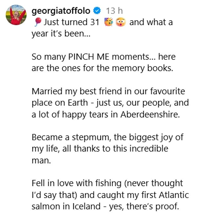 The pair tied the knot in March in a low-key celebration in Scotland, and Georgia also paid tribute to her love of the highlands in the post as she shared a snap from a fishing trip