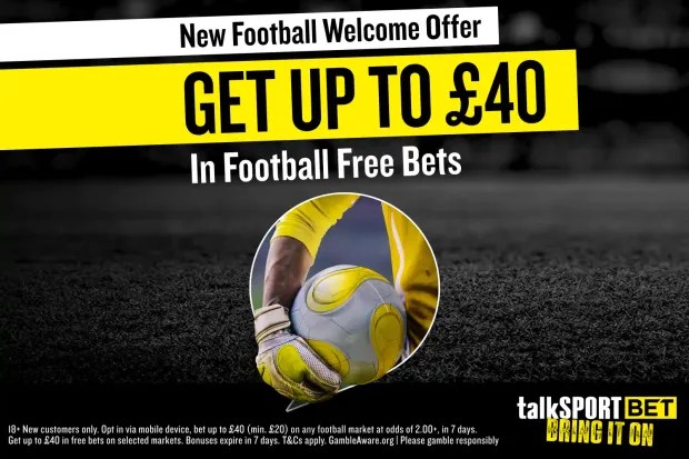 *talkSPORT BET. 18+ New customers only. Opt in and bet up to £40 (min. £20) via mobile or app on any football (odds 1/1+) within 7 days of registration. Get up to £40 in free bets on selected markets, which expire in 7 days. T&Cs apply, see below. GambleAware.org | Please gamble responsibly