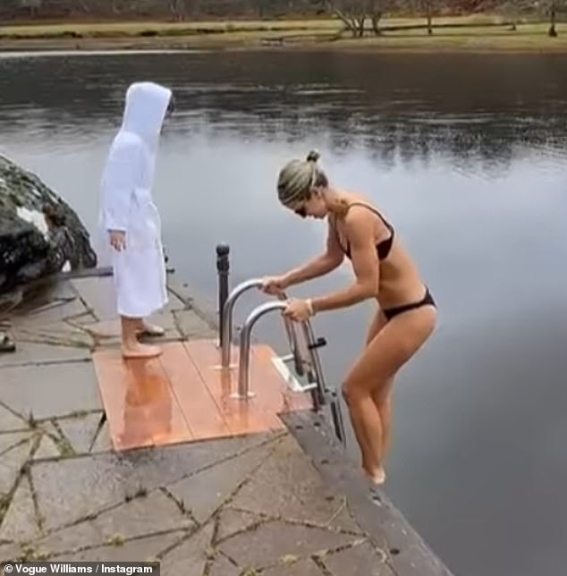 After heading down the steps, Vogue submerged herself in the water and shrieked as the cold took hold, with Theo laughing at her.