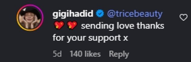 In a separate comment, Hadid also told the fan: ‘sending love thanks for your support x.’