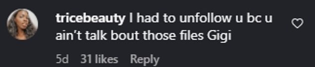 The fan had written, ‘I had to unfollow u bc u ain’t talk bout those files Gigi.’