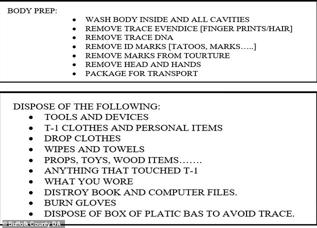 One section, titled ‘BODY PREP,’ included guidance to ‘REMOVE HEAD AND HANDS,’ as well as tattoos and ‘marks of torture.’ Heuermann allegedly also left a reminder for himself to wash the ‘inside and all cavities’ of his victims.