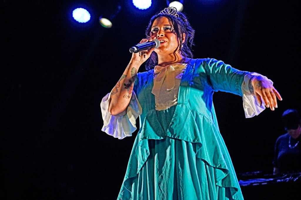 But for all the confrontation of the record, the show — to start with — is a gentle experience. Nokia, who’s from Harlem and is of Puerto Rican descent, comes on stage dressed in a sky-blue empire-line gown.