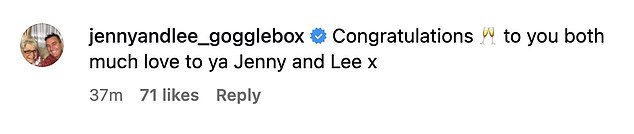 Meanwhile fellow Gogglebox favourite’s Jenny and Lee gushed: ‘Congratulations to you both much love to ya Jenny and Lee x’