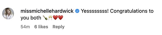 TOWIE’s Amy Childs added: ‘So happy for you’, while Emmerdale’s Michelle Hardwick wrote: ‘Yessssssss! Congratulations to you both’.