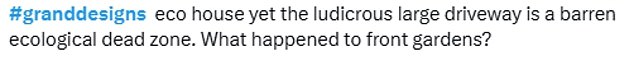 But a third pointed out: ‘Eco house yet the ludicrous large driveway is a barren ecological dead zone. What happened to front gardens?’