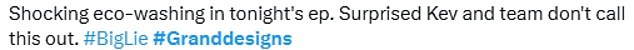 One person said: ‘Shocking eco-washing in tonight’s ep. Surprised Kev and team don’t call this out.’