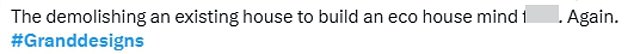 They added: ‘The demolishing an existing house to build an eco house mind f***. Again.’