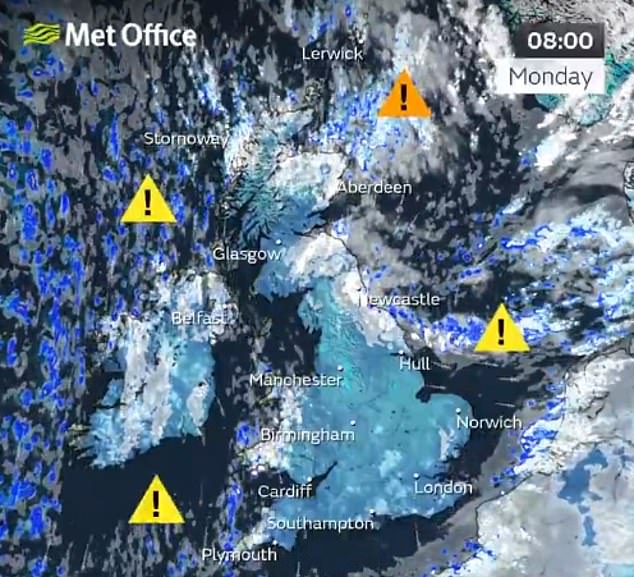 The UK Health Security Agency (UKHSA) has also issued an amber cold health alert, as an early warning that adverse temperatures are likely to affect health and wellbeing, for England, running until Tuesday.