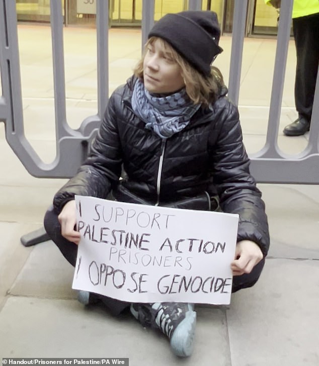 Footage shows the 22-year-old climate activist holding a sign saying ‘I support Palestine Action prisoners, I oppose genocide’