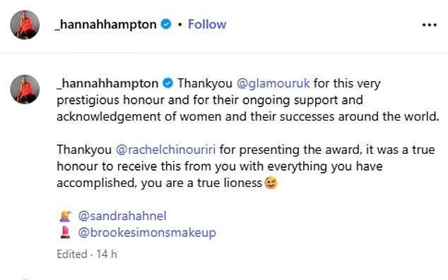 Sharing a series of images from Glamour’s Women of the Year Awards, Hampton wrote: ‘Thankyou @glamouruk for this very prestigious honour and for their ongoing support and acknowledgement of women and their successes around the world.