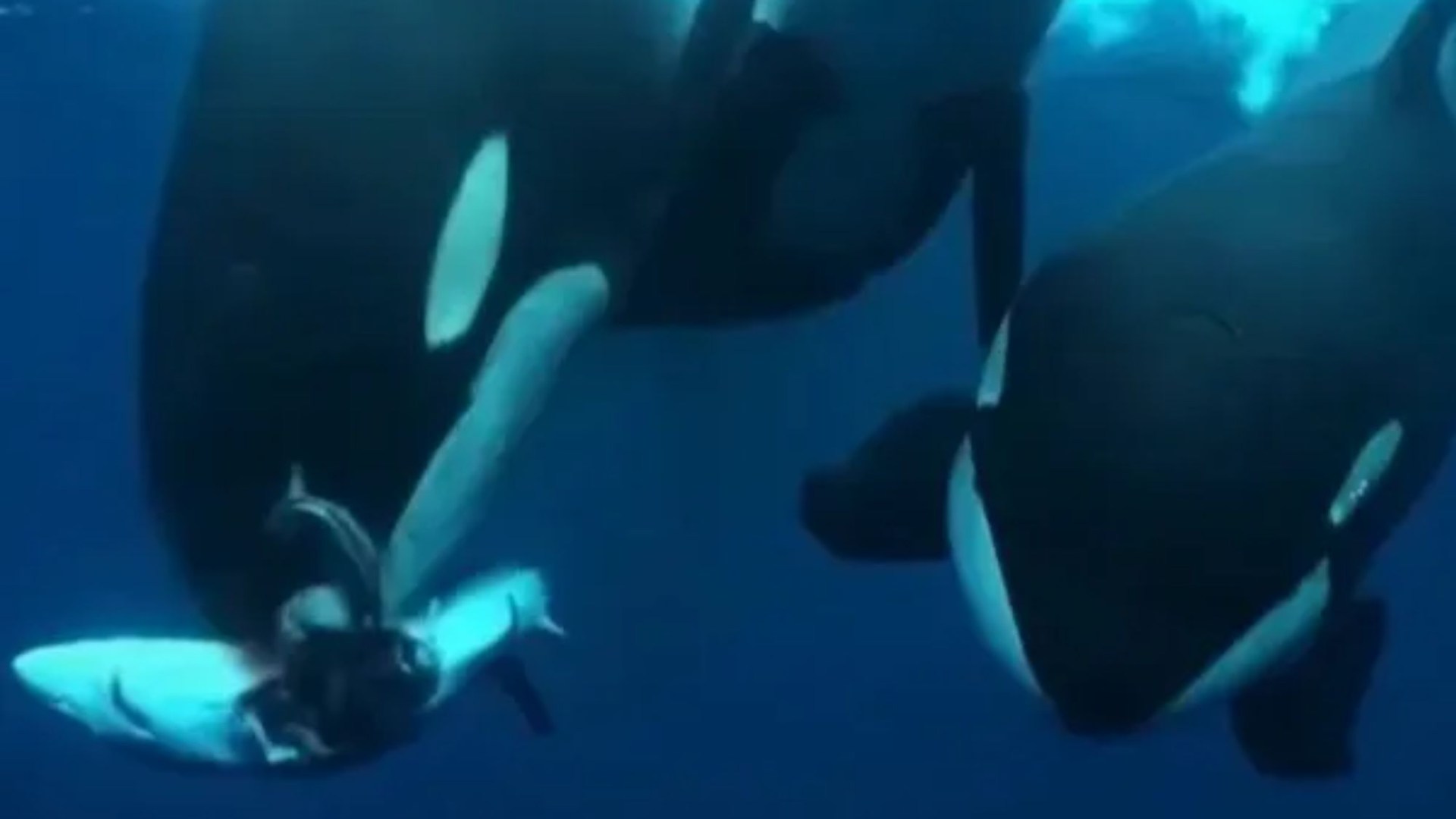 Terrifying footage shows three huge whales passing the lifeless carcass of one of the ocean’s deadliest predators between themselves.