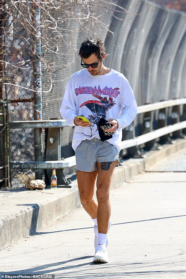 Harry Styles flashed his leg tattoos while enjoying an early morning run in New York on Wednesday as he took a break from promoting his new album