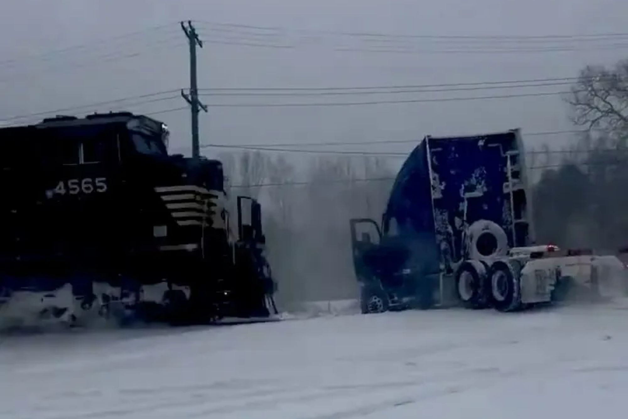 Heart-stopping moment train smashes into a truck stuck on the rail line after a ‘bomb cyclone’ snowstorm