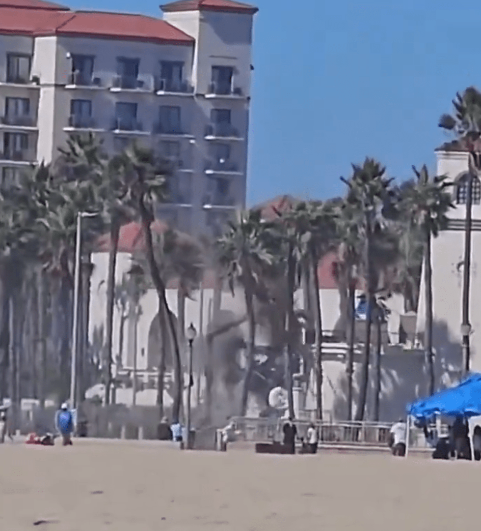 In a video captured by an onlooker, the chopper can be seen hovering next to a row of flats at Huntington Beach, California.