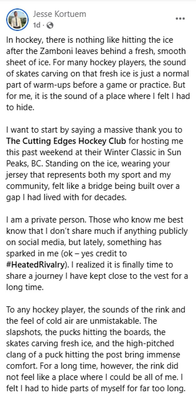 Kortuem said he got back into playing hockey ‘at a high level’ as an adult, though he ‘still could not bring myself to be fully out on my adult hockey teams’.