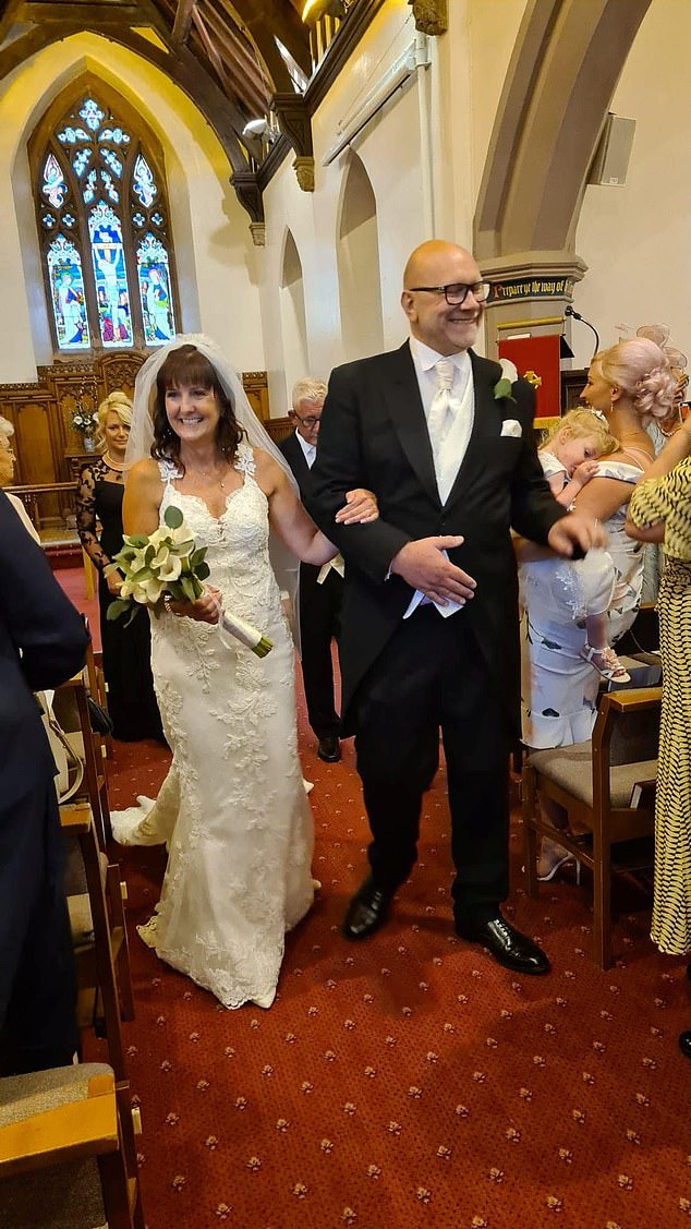 Suzanne Cherry, 62, with her husband Clint Harrison on their wedding day. Suzanne was killed after a van mowed her down on a golf course