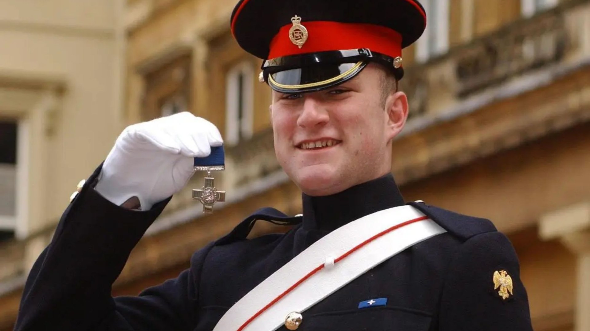 An image collage containing 1 images, Image 1 shows Christopher Finney wearing a military uniform and holding the George Cross medal