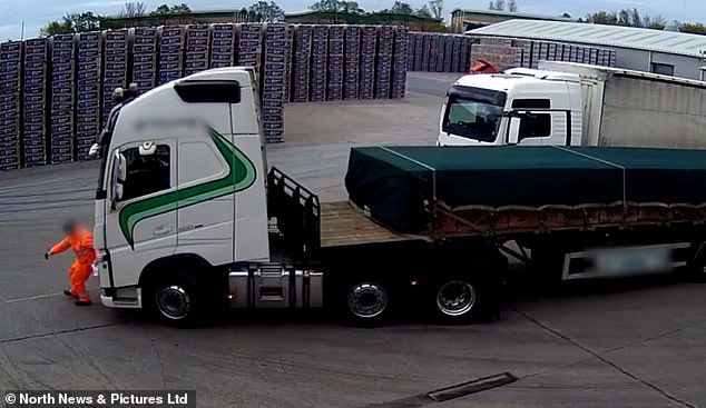 The boss appears taken aback at first when the driver hits him at speed, stumbling along as the HGV pushes him across the yard.
