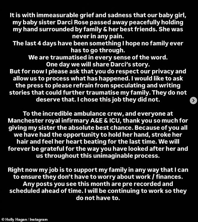 Holly wrote in her post: ‘It is with immeasurable grief and sadness that our baby girl, my baby sister Darci Rose passed away peacefully holding my hand surrounded by family & her best friends. She was never in any pain.